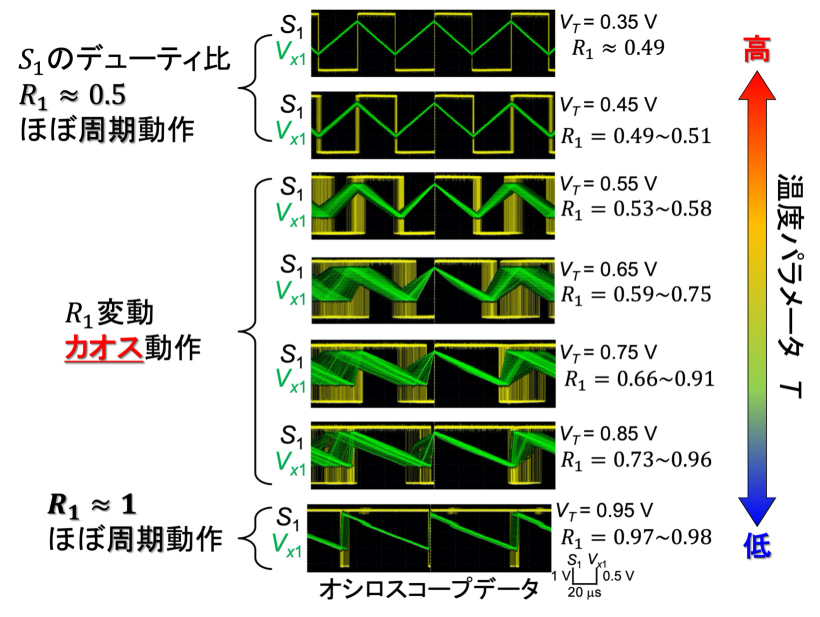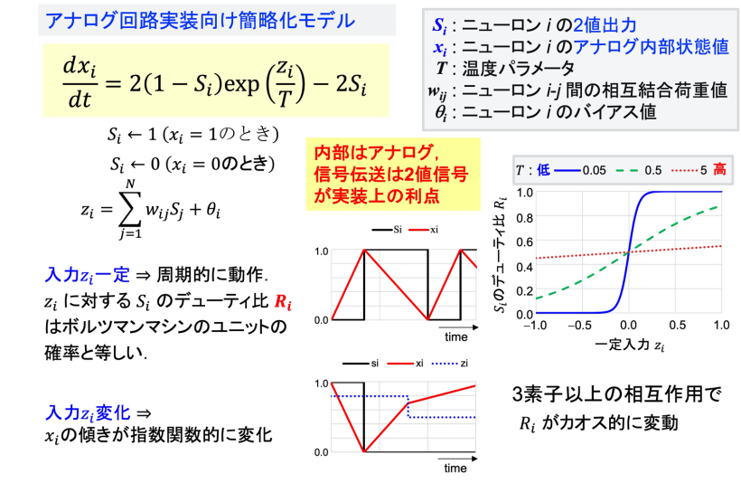 カオスボルツマンマシン(Chaotic Boltzmann Machine: CBM)は,よく知られた古典的ニューラルネットワークモデルであるボルツマンマシンの,確率的動作をカオス動作で置き換えたモデルです.ニューロンユニット内の指数関数演算により非線形性を実現し,3ニューロン以上のネットワークでカオスを生じることが知られています.本プロジェクト(NEDO2a)ではディジタル回路(FPGA)での実装を行っており[文献],アナログ集積回路チップも開発済みです[文献].