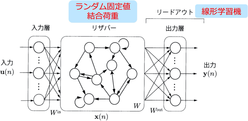 ちなみに,リザバーと同じように固定ランダム結合を有していますが,リカレント結合ではなく入力から出力へのフィードフォワード結合のみのネットワークからなるモデルは,エクストリーム学習器(Extreme Learning Machine)と呼ばれます.また,誤差逆伝搬学習の逆伝搬部分の荷重をランダムにして,層毎ではなく一気に全層で学習を進める学習法としてダイレクトフィードバックアラインメント(Direct Feedback Alighnment)法という手法が知られています.このように固定ランダム荷重を用いる手法は新規デバイスや材料系で実現しやすく,注目されています.