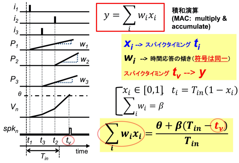この方式では情報は時間タイミングで表現され,早く(遅く)入力されたスパイクが大きな(小さな)値を表現します.入力タイミングからシナプス荷重に比例する傾きでニューロン内部状態寄与分が増加(または減少)し,全入力からの寄与の総和が内部状態となります.これが所定のしきい値を超えたタイミングでスパイクが出力されます.この出力タイミングは入力と荷重の積和演算結果を表現します.