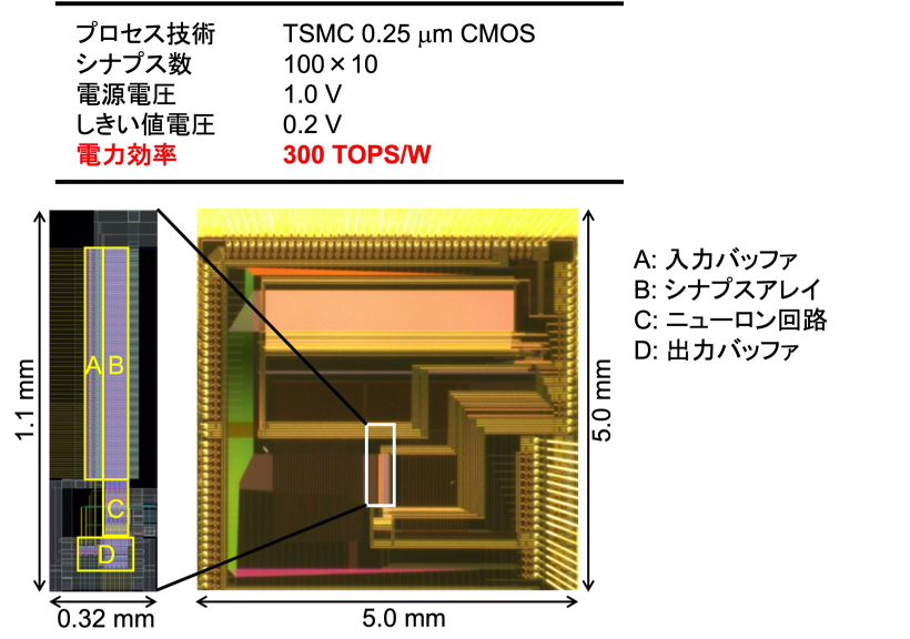 TACT方式により,0.25μmCMOS技術を用いて積和演算回路を設計・試作しました[文献].シナプス荷重はSRAMセルを用い,シナプス抵抗はMOSFETのサブスレショルド領域動作により1GΩ以上を実現しました.この回路は300TOPS/Wの演算効率を達成しましたが,より微細な製造技術を用いることでさらに演算効率を向上させることが可能です.本プロジェクト(NEDO2b)では,SONOS型アナログフラッシュメモリ素子でシナプス荷重を実現するAIチップを開発しています.