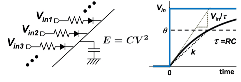 我々がTACT(Time-domain Analog Computing with Transient states)と名付けた計算モデルと集積回路方式は,最も簡単なスパイキングニューロンモデルである積分発火型ニューロンモデルにヒントを得て,究極の低消費エネルギーで積和演算を行うことができる,時間領域アナログ集積回路方式です.これは近年,専用AIチップの先端研究で主流になっているインメモリ計算(CiM)方式での究極的な高効率方式と考えています.